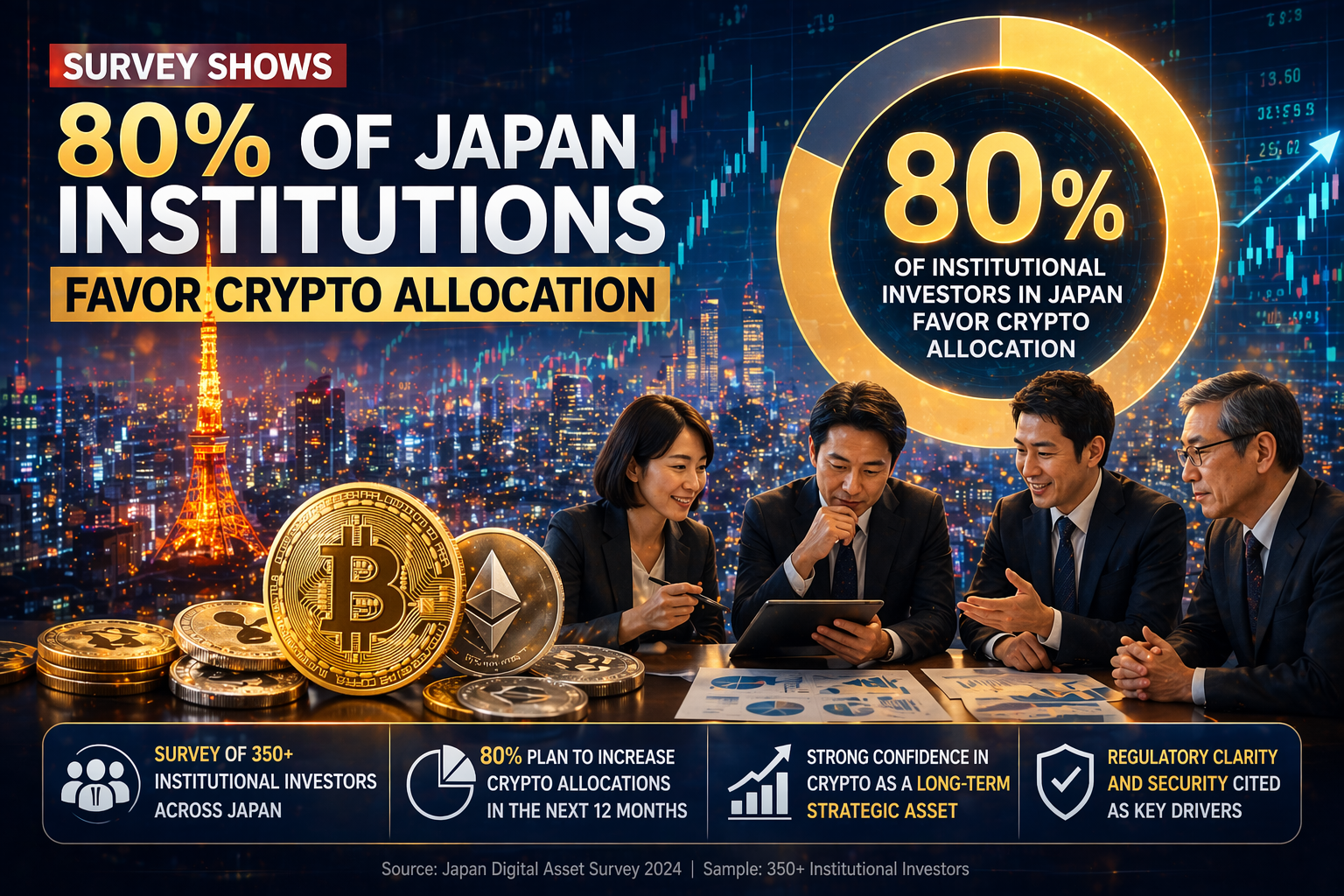 Almost 80% of Japan’s institutional investors want to include crypto within the next three years, indicating a change from cautious curiosity to active portfolio planning, according to a poll conducted by Nomura and its digital asset unit, Laser Digital.